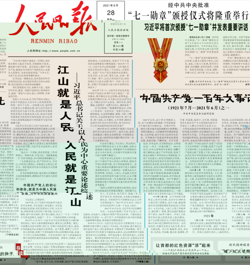 一百年來,我們黨為民族謀複興。中華民族以五千年傳承不絕之文化,卓然于世界。自1840年起卻一路沉淪,被迫簽訂了一系列不平等條約,一幅列強争食的《時局圖》就是寫照,“多屈辱啊!多恥辱啊!那時的中國是待宰的肥羊。”中國共産黨帶領億萬人民,救國、興國、富國、強國,創造了世所罕見的經濟快速發展奇迹和社會長期穩定奇迹,書寫下震撼世界的巨變。當年,孫中山先生曾在《建國方略》一書中構想中國建設的宏圖,有外國記者認為這完全是一種“空想”。如今,鐵路進青藏、公路密成網、高峽出平湖、港口連五洋、産業門類齊、稻麥遍地香、“天和”駐太空、“祝融”探火星……在中國共産黨的堅強領導下,社會主義中國巍然屹立在世界東方。我們用幾十年時間走完了發達國家幾百年走過的工業化曆程,躍升為世界第二大經濟體,綜合國力、科技實力、國防實力、文化影響力、國際影響力顯著提升。百年輝煌,中國共産黨對中華民族的偉大貢獻,體現在帶領億萬人民徹底改變了近代以後100多年中國積貧積弱、受人欺淩的悲慘命運,中華民族迎來了從站起來、富起來到強起來的偉大飛躍。